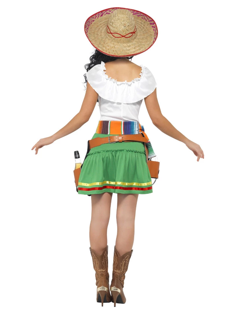 This women costume includes a green dress with white top, serape-patterned sash and belt with bottle holsters.