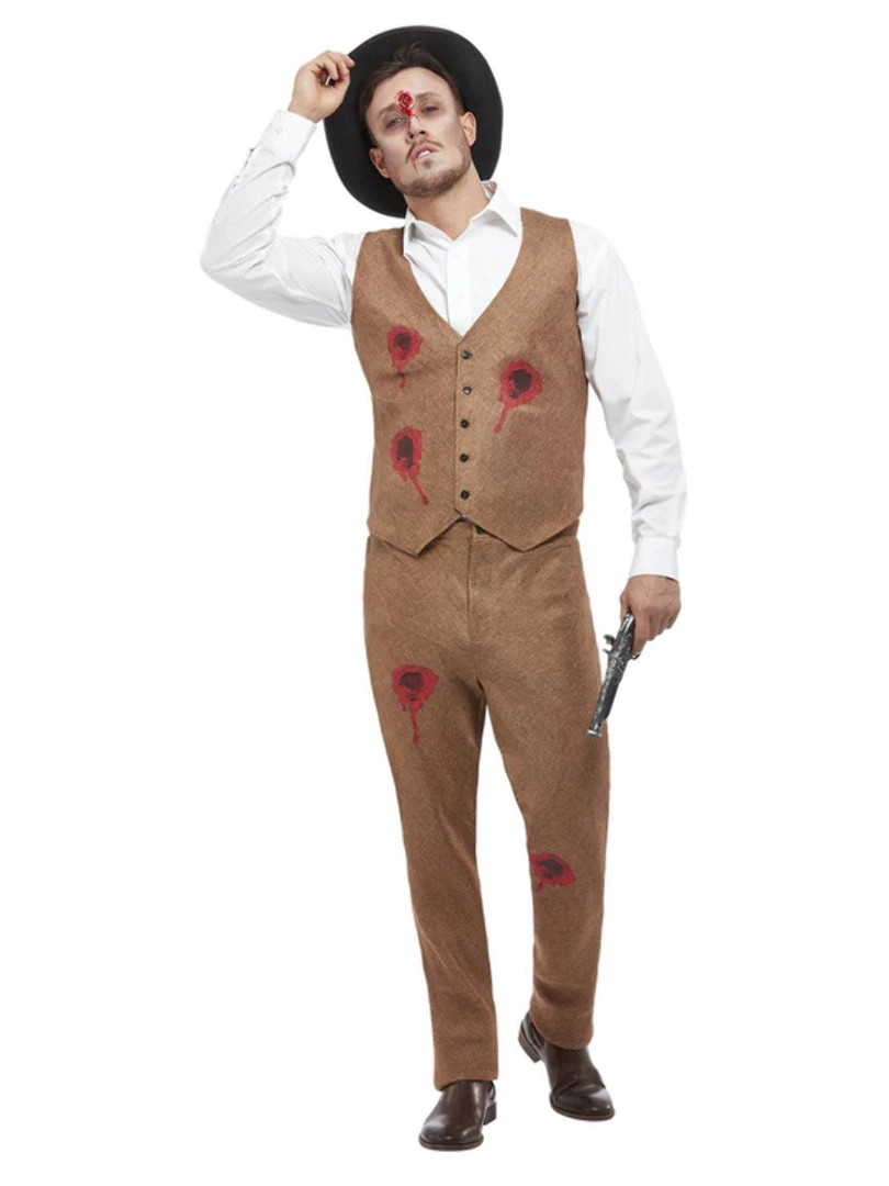 The Halloween party will never complete without a Zombie costume. Hence this Clyde Zombie Gangster Costume is the perfect one to purchase for your next Halloween party. The brown costume comes with a waistcoat, trousers, hat and a gangster gun. The costume comes with bullet marks all over resembling the perfect gangster Zombie of the season.