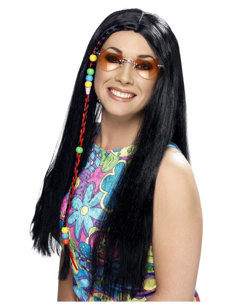 Get ready for the Halloween party with our Smiffy’s hippie party wig. The long black hippie wig comes with coloured beads attached on it. Shake your body on the dance floor with this beautiful hippie wig.