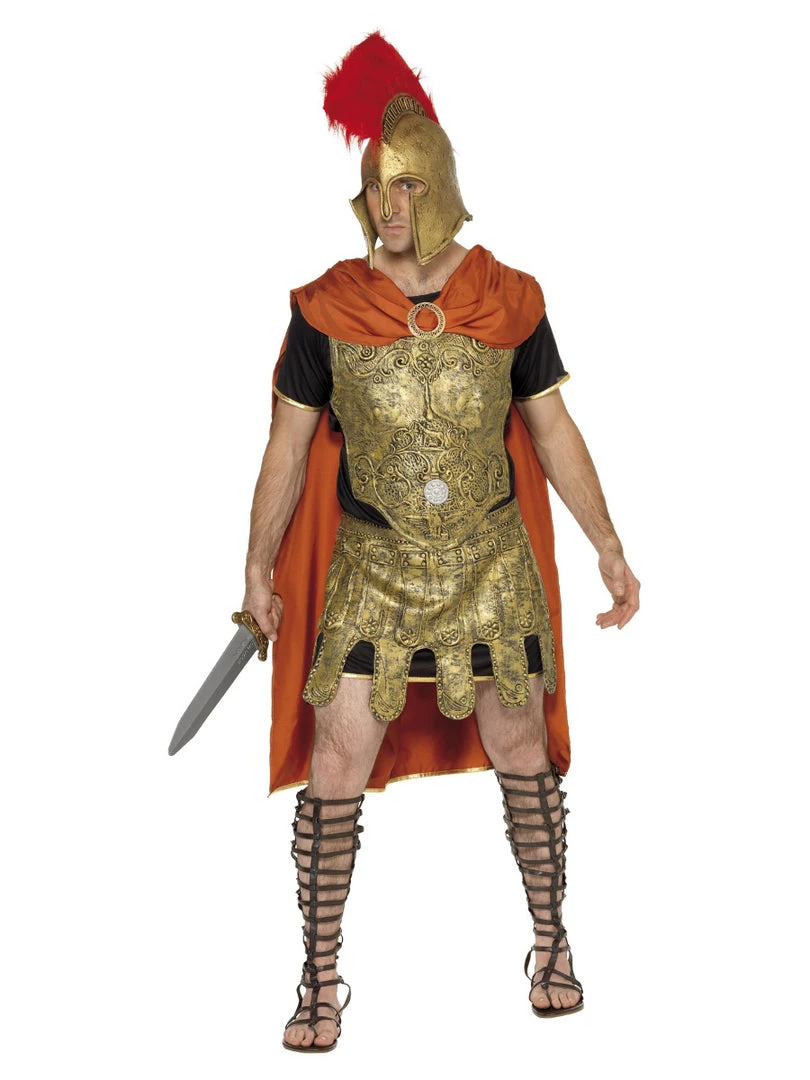 Show the warrior in you in the next theme party. This men’s Roman soldier tunic costume will show your love for the Roman empire. This gold costume set includes a tunic and armour, breastplate and skirt. The costume also has an orange cape. Complete your costume with a Roman warrior helmet and lace up shoes to fight for the Romans.