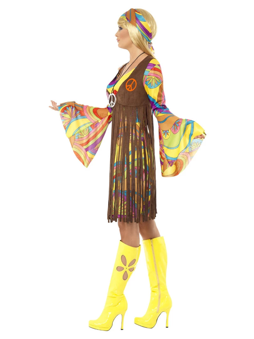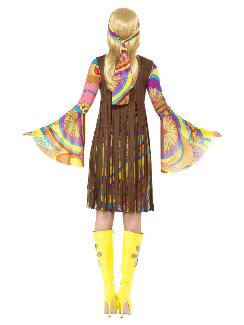Get groovy with our women’s 1960’s groovy lady costume this Halloween. This brown costume includes this long dress with printed waistcoat and a headband. You can complete your look with a long medallion and rock the next party with this costume.