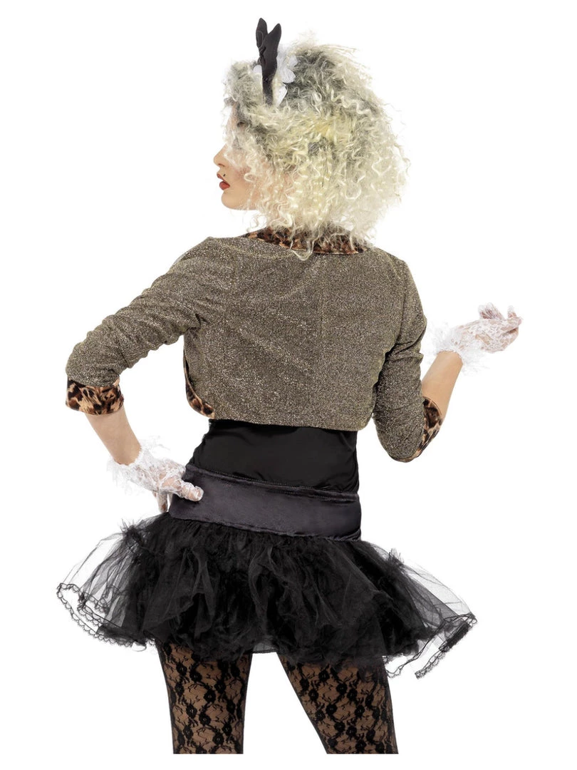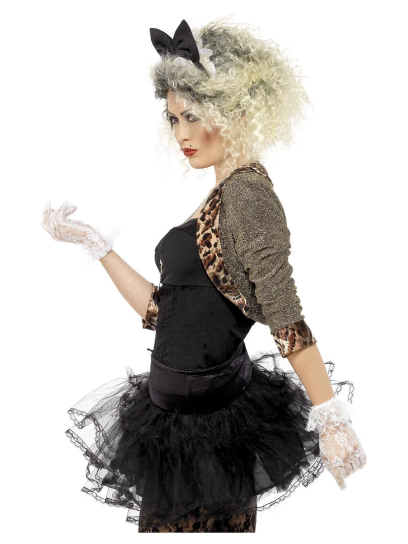 Unleash your inner wild thing in this 1980’s costume for women. This wild child costume will have you turning heads at your next costume party! This 1980’s wild child costume features a leopard jacket, black top and tutu, lace-look leggings, white gloves and a black headband. Ideal for outdoor or indoor events, Perfect for your 80’s Theme party.
